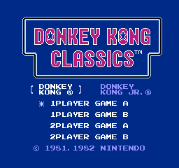 In the combo cart "Donkey Kong Classics", which contains both Donkey Kong and Donkey Kong Jr, the two distinct NES title screens were removed and replaced with a singular title screen for selecting modes (with up and down directions) and the specific game (with left and right directions). This menu times out into demos for the two games in an alternating pattern, and each time it returns to the title screen, it alternates between the title songs of the two original NES releases. Notably, even with the expanded ROM size, the developers didn't take the opportunity to restore the 50m level to the original Donkey Kong.
