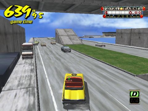 Y, normally used for honking in the final, is used to change the camera in this prototype. It can cycle between 6 different modes: one angled down at the car, an overhead camera mode oddly reminiscent of the pre-3D-era Grand Theft Auto games, a static camera that simply stays put rather than looking at the taxi, a front hood mode which points to the front of the car, and a replay camera which shoots the car from many cinematic angles. The sixth mode is apparently nothing but a black screen. By plugging a controller into Slot D, further options are added, such as pressing A to freeze the game and zooming in and out using the A and B buttons.