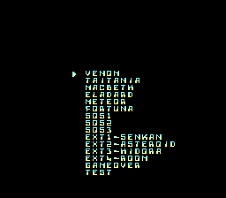 All of the debug scene IDs have been changed. In the Test menu, the six planet levels now have their finalized names. The SOS stages have been moved above the EXT options, and two new entries, Game Over and Test, have been added. Both options are designed to test the game over cutscene. However, the 'Test' option functions in a bugged state, causing to be in both gameplay and cutscene states. The Training menu has also been adjusted; it now loads to the map introduction sequence (however, in this case the game asks for a second player).