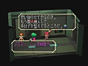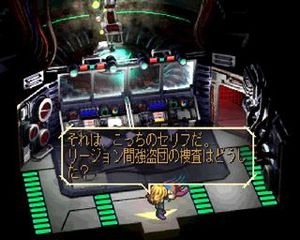 There exists a debug room, but it's nowhere near as full-featured as the one in, say, Final Fantasy VII. Nevertheless, it has a few interesting functions. To enter it, input GameShark code 8001300C 02E1 and load a saved game. If successful, you should be in a large, empty blue room with some purple Japanese characters reading さんぷる (Sample) "spraypainted" on the floor, in hiragana, which is weird, since English words like this are usually written in katakana. Disable the code, and walk to the right until you reach a screen with all the game's playable characters.