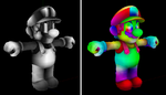 DemoMario has a higher polygon count, a slightly different texture setup, and brighter overalls than the final Mario. Still, it only has two animations... but the most interesting feature of this model is its set of alternate suits; one appears to be an early design for the Ice Flower suit, while the other is unlike any of the final power-up suits in the game. It may be simply yet another early Ice Mario model, but it could very well be a design planned for a different power-up. The gloves of this model are similar to the ones used in the prerendered cutscenes.