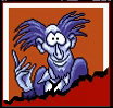 An animation of Woodruff with a simplified color scheme. The red stripes on his pants and the skull on the back of his shirt only appear in a couple of frames, and his headband and shirt are dark blue instead of black, as are his boots. He appears to be taking what looks like a third boot out of his pocket. The blank last frame is part of the data.