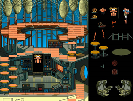 The Bigwig's lair in various stages of planning. The sprites on the right side show a softer version of the Bigwig and unused bloody skulls and arms. The moustachioed man is never seen.